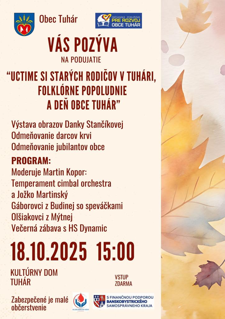 Obec Tuhár Vás pozýva na podujatie "Uctime si starých rodičov v Tuhári, Folklórne popoludnie a Deň obce Tuhár" v sobotu 18.10.2025 so začiatkom o 15:00 hod. v Kultúrnom dome v Tuhári.