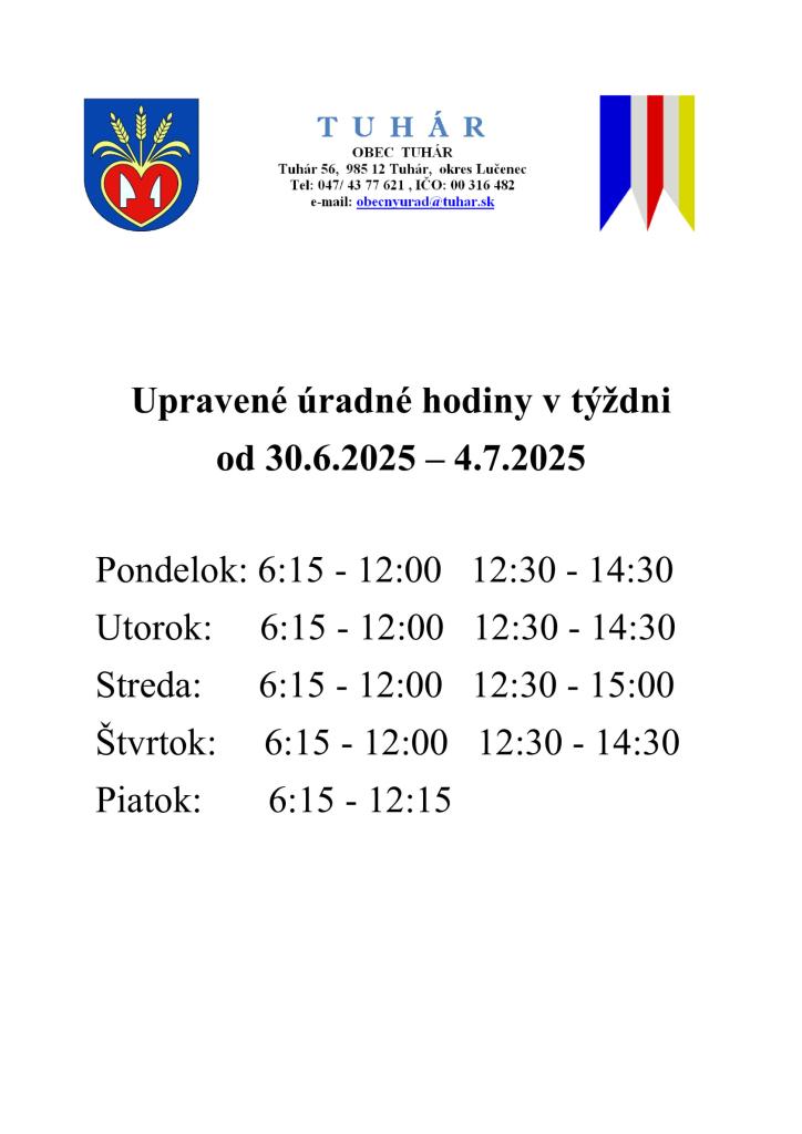 Upravené úradné hodiny na Obecnom úrade v Tuhári v týždni od 30.06.2025 - 04.07.2025.