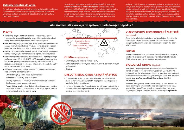 Spaľovanie komunálneho odpadu na voľnom priestranstve a vo vykurovacích zariadeniach v domácnostiach je zakázané. Vyplýva to zo zákona č. 79/2015 Z. z. o odpadoch v znení neskorších predpisov, zákona č. 314/2001 Z. z. o ochrane pred požiarmi v znení neskorších predpisov a Občianskeho zákonníka.